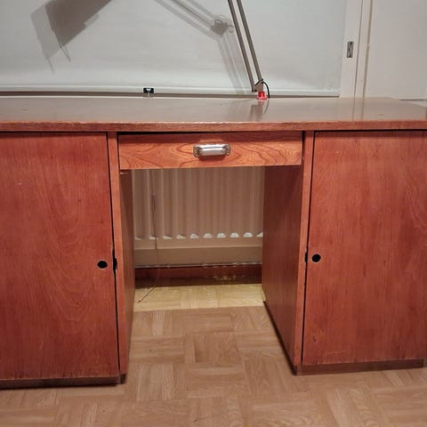 Tummanruskea työpöytäsetti. Pöytä, kaksi laatikostoa ja tuoli. Toisesta laatikostosta puuttuu yksi rengas.