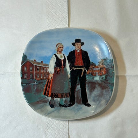 Arabia - Suomalaisia kansallispukuja seinälautanen. Lavansasri ja Seiskari. Lautasen halkaisija on 12 cm. Seinälautanen on ehjä ja hyväkuntoinen. Suunnittelija Veikko Roininen.