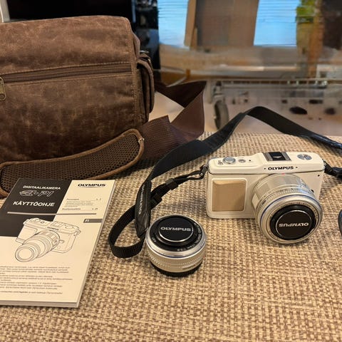 Tästä Olympus OM-D E-M1 Mk I kamerarunko. On ollut käyttämättä useita vuosia, mutta meni laatikkoon täysin toimivana.