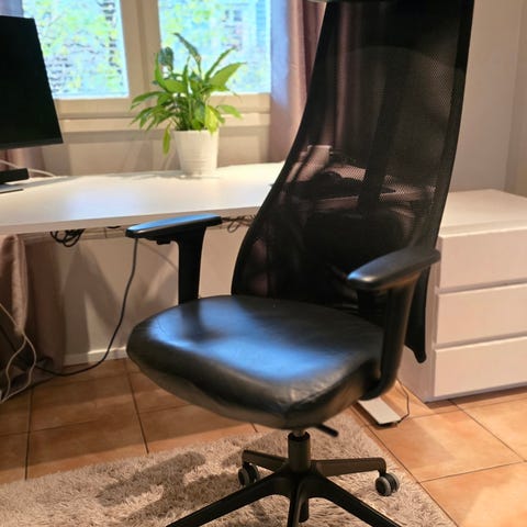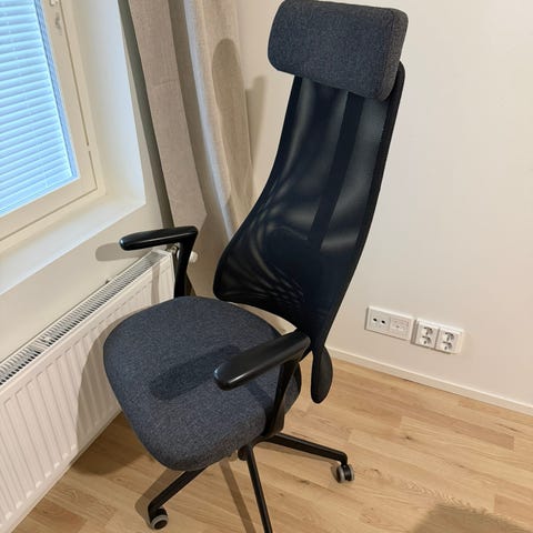 Ikea Järvfjället Toimistotuoli, ilman käsinojia, alapuolen kangas irronnut ja vetoketju rikki, ei haittaa käyttöä, muuten hyväkuntoinen.