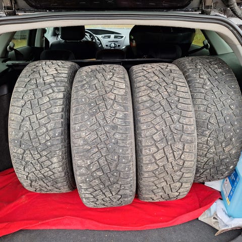 Kumhon nastarenkaat 175/65/14. Talven näillä ehkä ajelee, nastoja puuttuu, kulutuspintaa 5 mm.