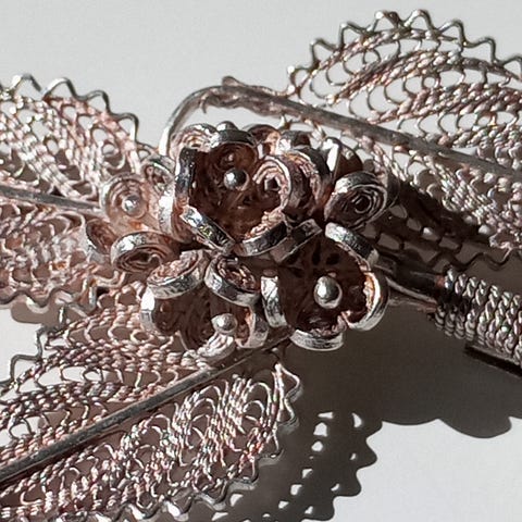 Komea 60-luvun kukka-aiheinen filigraanirintakoru. Halkaisija noin 60 mm. Paksuus keskeltä noin 15 mm lukko mukaan lukien eli aika muhkea koru. Hopeana ostettu, mutta selkeitä leimoja ei löytynyt ja ulkomailla valmistettu eli ei välttämättä ole leimattu. Hopean patinaa ja pientä filigraanin kulumaa, neulassa tummia kohtia. Kaunis vanha rintaneula.