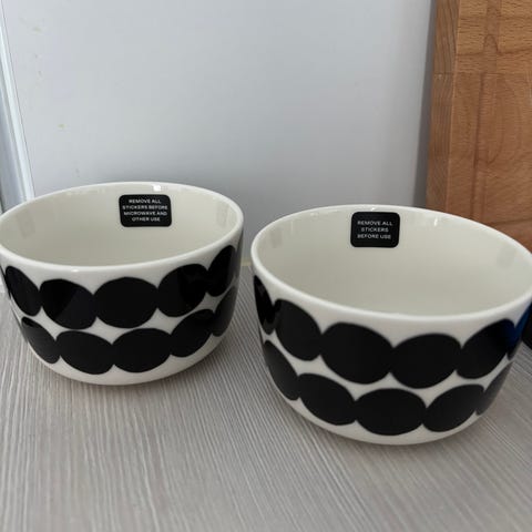 Marimekko Siirtolapuutarha kulho, tilavuus 0,5 litraa. Valkoinen kulho, jossa musta ja beige pilkkukuvio. Materiaali posliinia.