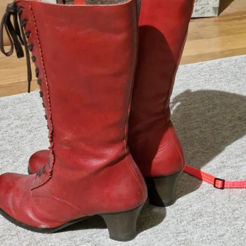 Mustat, todella hyvässä kunnossa olevat pitkät, korkeakorkoiset nahkasaapikkaat. Sivussa vetoketju. Käytetty tosi vähän. Koko 43, pohjan pituus 27 cm. Korko 7 cm. Saappaan koko korkeus 49 cm. Saapikkaan leveys n.9-9, cm päkiän kohdalta. Nilkan kohdalta ympärys n. 31.5 cm ja pohkeen kohdalta n. 39.5 cm. Hp. 50 e + postikulut.