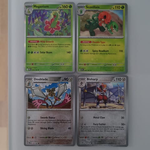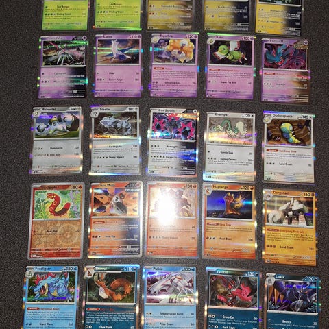 Kortteja on common, uncommon ja rareja sekaisin. Jokainen nippu sisältää 100 erilaista korttia. Kortit ovat Scarlet & Violet ja Sword & Shield ajalta, eli noin 2022-2025. Jokaisessa nipussa on 20 holo rare korttia, sekä 80 reverse holo korttia. Kortit ovat erinomaisessa kunnossa. Koska kortit on lajiteltu valmiiksi 100kpl nippuihin, en pysty valitsemaan niihin juuri tiettyjä haluttuja kortteja. Kannattaa katsoa myös toinen ilmoitukseni, jossa erilaisia 100 kortin nippuja.