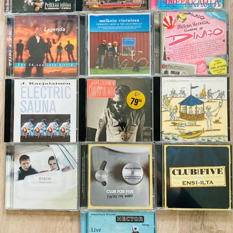 Kokoelma cd levyjä, yht. 320 kpl ( muutama ylimääräinen) eli n. 0,30 €/kpl. Pääasiassa kotimaista, Eput, Juice, J. Karjalainen, Lapinlahdenlinnut, Hector, Jope Ruonansuu ym. ym. Myydään kaikki kerralla. Nouto Kuusankoskelta.
