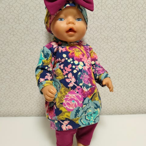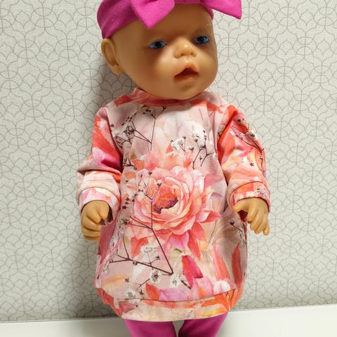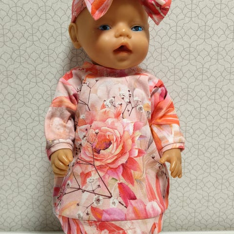 Baby Born nuken uimapuku, jossa on ruusukuviointi. Ei ole merkkituote. Valmistettu pehmeästä ja joustavasta materiaalista. Helppo pukea nukelle. Nukke ei kuulu kauppaan.