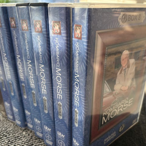 Myydään Komisario Morse DVD-boksi, joka sisältää sarjan kaikki jaksot + erikoisjaksot.