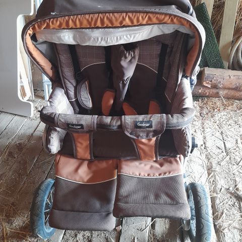 Emmaljunga lastenrattaat ruskeassa värissä. Rattaissa on säädettävä istuinosa ja tukeva runko.