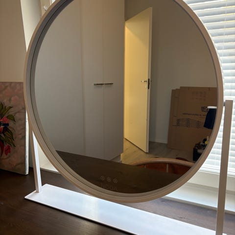 Valkoinen meikkipeili kirkkailla valoilla. Kunto vastaa lähes uutta. Hinta uutena 600€