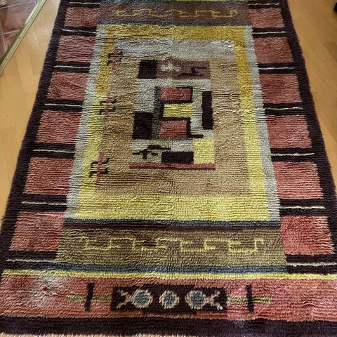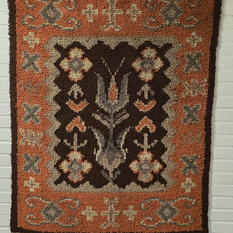 Erittäin siisti, hyvänukkainen villaryijy. Suunnittelija Riitta-Maija Oksanen.