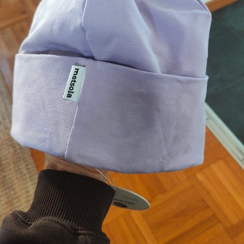 Metsolan söpö pitkä vaaleanpunainen tonttulakki valkoisella tupsulla. Koko 5-6Y mutta mielestäni himpun naftia mitoitusta, meidän lähes 6-vuotiaalle jo liian pieni. Materiaali on kyllä venyvää mutta ei ole kiva, jos puristaa liikaa. Hyväkuntoinen, ainoana miinuksena se, että valkoinen tupsu on ommeltu lakkiin kiinni. Alkuperäisesti tonttulakissa tupsu on kiinni nepparilla, jonka lapseni sai jotenkin irroitettua.