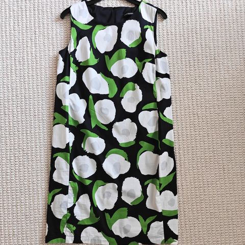 Marimekko. Erittäin laadukas ja hyvin leikattu (muotolaskokset) tukevaa kangasta ja vuorellinen a-linjainen juhlamekko. 97% puuvillaa ja joukossa vähän elastaania joka tuo joustoa. Kuin uusi eli ollut kahdesti päällä. Kai-kai 46 cm. Pituus 115 cm. Sivusaumoissa taskut. Vetoketjukiinnitys niskassa. Koko 36.