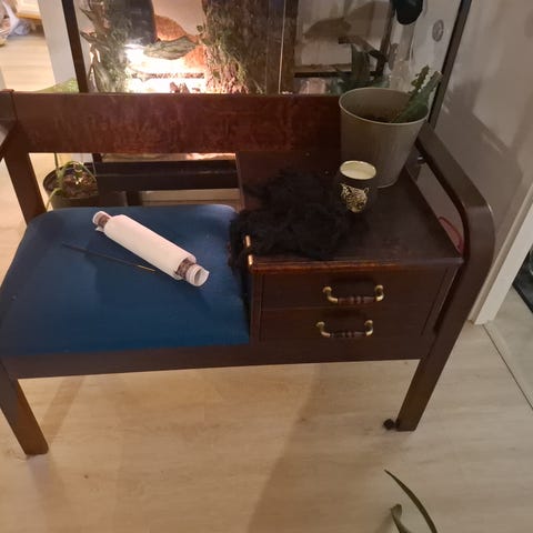 Tammea oleva puhelinpöytä. Mitat noin K.75, L.95, S.50. Ehjä, maalipinnassa jälkiä. Tarjoa!