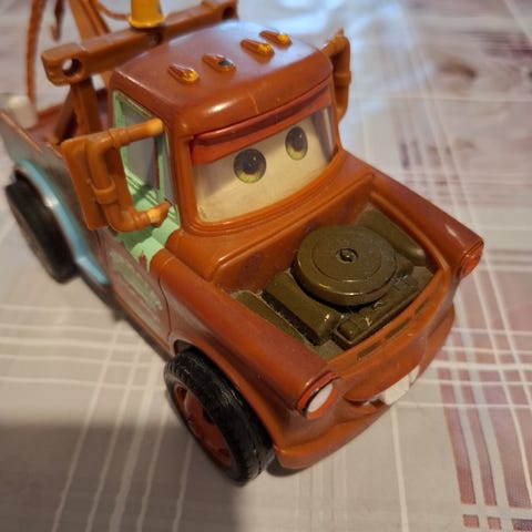 Hyväkuntoinen Disney Pixar Cars Martti -hinausauto. Takapuskurin tarrassa hiukan kulumaa. Pituus n. 9 cm, leveys n. 4,5 cm, korkeus n. 4,5 cm.