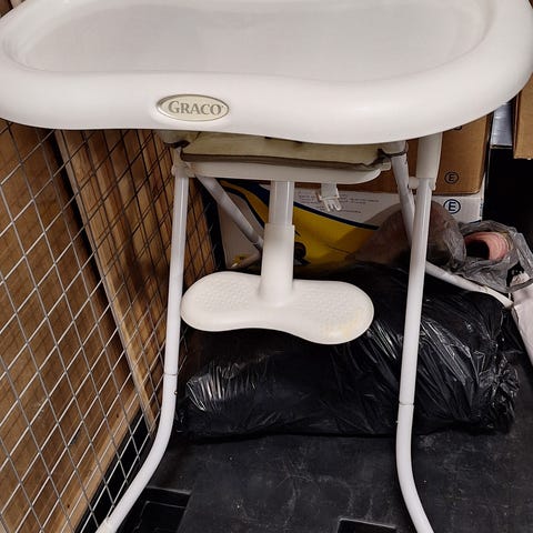 Graco vauvan keinutuoli, jossa on sinivalkoinen pilkullinen verhoilu ja pehmustettu istuin. Keinutuolissa on turvavyöt ja lelukaari vauvalle. Keinutuolessa on säädettävä keinunopeus, joka tarjoaa kaksi eri nopeustasoa.