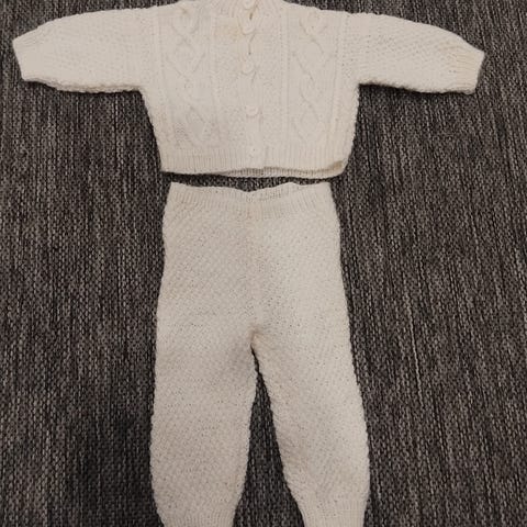 Itse neulottu lämmin vauvan villapuku. Villatakki, villaiset housut ja myssy ja parit villatöppöset. Koko n 62/68