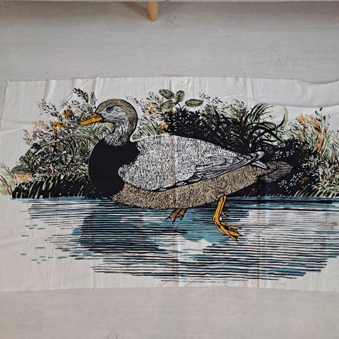 Kankaan koko 51 x 298 cm. Pitkät reunat pakan reunat, ei tarvitse kääntää. Leikataan kankaassa olevia leikkuuviivoja pitkin kuuteen servettiin. Kangas luullakseni pellavaa, en pysty sanomaan varmuudella. Voi olla myös puuvilla/pellava sekoite. Yksi lankavirhe reunassa, näkyy lähinnä nurjalla puolella (kaksi viimeistä kuvaa virheestä). Muuten kangas hyväkuntoinen, säilytetty viikattuna muovipussissa.