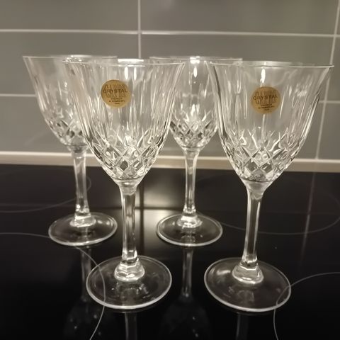Punaiset viinilasit kristallilasit pahvilaatikossa. Yhteishintaan. Nouto.