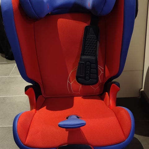 Lisäkolarisuoja sivuilla, ohjauslenksu vyölle jalkojen välissä. ISO-fix kiinnitys. Painoraja 15-36kg, meillä käytetty n. 145cm+ asti mukavasti. Ei postiteta.