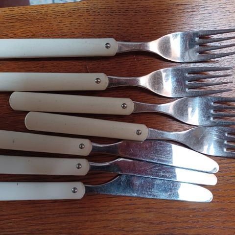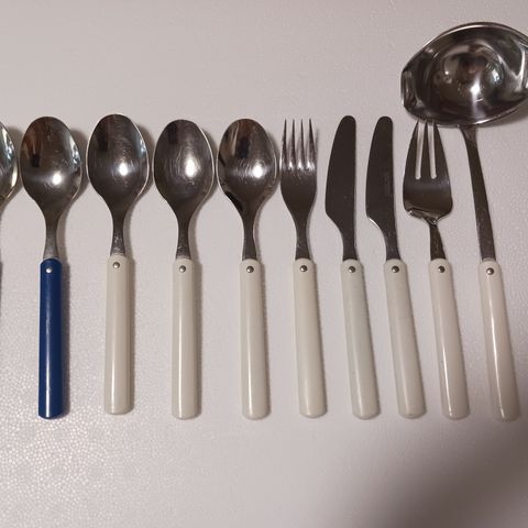 Käytetyt ruokailuvälineet . 3e/ kpl . Käyttökolhut pitäisi kuvassa näkyä . Ruokalusikoita ( pituus n. 20cm ) 6 kpl , haarukoita 2 kpl ja yksi (1) ruokaveitsi . Nouto mp tai toridiilinä .