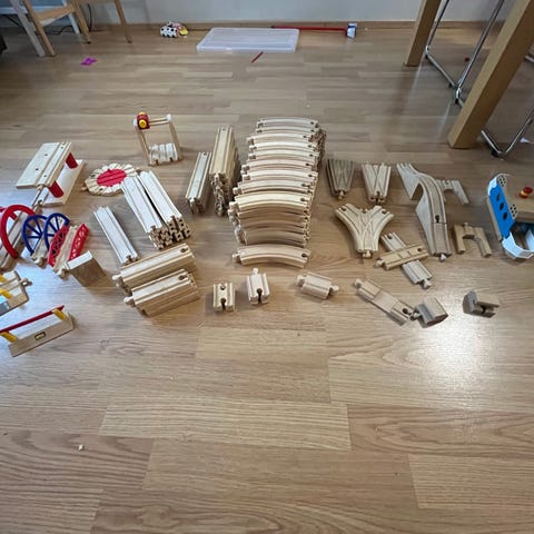 Puinen junarata leikkisetti sisältää erilaisia puisia junaradan osia, mukaan lukien siltoja, 2 asemarakennusta, junavaunuja ja tunneleita. Myös yksi paristoilla toimiva veturi.