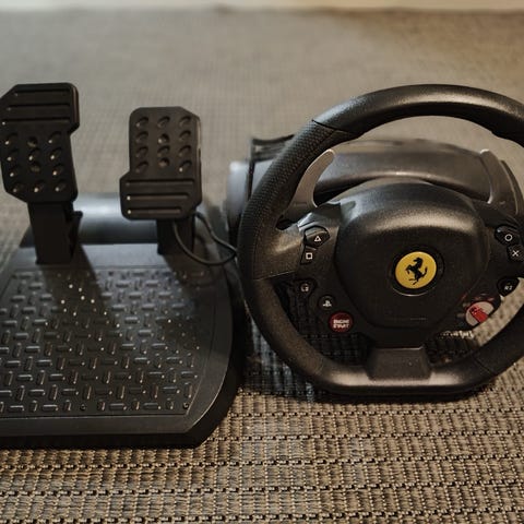 Tästä pukin pakettiin vähän käytetty ratti ja polkimet yhdistelmä. Sopii PS4, PS5 ja PC. Kiinnitysmekaniikka pöytään. 8:10 kopio Ferrari 488 ratista. Vaihteenvaihtimet ratissa.