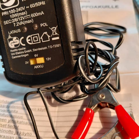 Myydään vähän käytetty mopon/moottoripyörän akun laturi. Mukana monikielinen käyttöohje (myös. suomi).