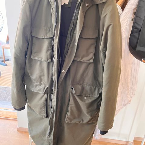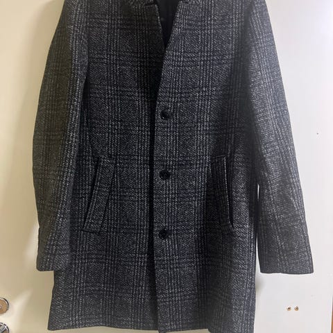 Harmaa miesten pitkä takki, koko M. Takissa on napitettava etuosa ja kaksi etutaskua. Kaikin puolin hyvä, mutta itsellä ei ole käyttöä.