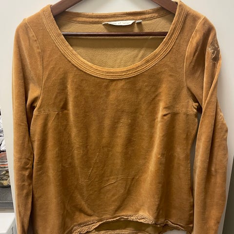 XS koon ruskea pusero, jossa etuosa ja hihat on trikoota, takana ohut, rypytetty polyester. Siisti kunto, 3e. Nouto.