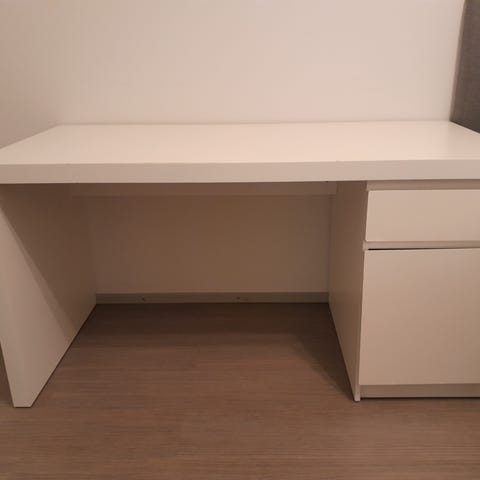Käytönjälkiä pöydän pinnassa ja laatikoissa. Ollut kahdella lapsella käytössä. Maalipinta pöytätasossa osittain vaurioitunut. Muuten ehjä