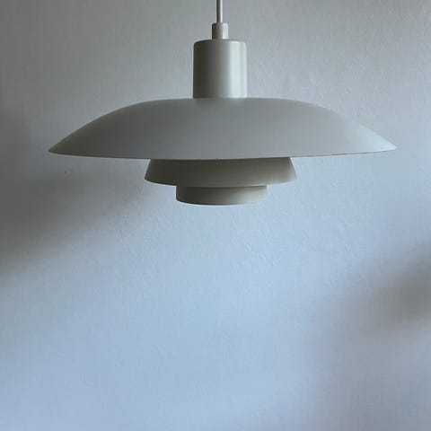 Kattovalaisin PH-5 Louis Poulsen. Tässä valaisimessa on idea, että valo suuntautuu alaspäin häikäisemättä. Harvinasempi valk-/sini. väri. Halkaisija 50cm ja korkeus n,27cm. (Uuden ovh. 750e)