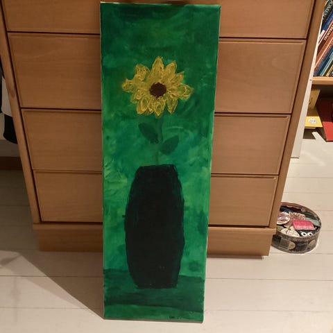 Öljyvärimaalaus (oletan näin), jossa punaisia tulppaaneja sinisessä maljakossa.