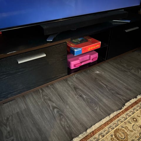 Annetaan tv-taso. Tämä on ollut aiemmin osa hyllyä, joten yläpinnassa on muutamia tappien reikiä ja sivussa yksi, mutta muuten on siistissä kunnossa. Haku Kaakkurista.
