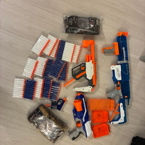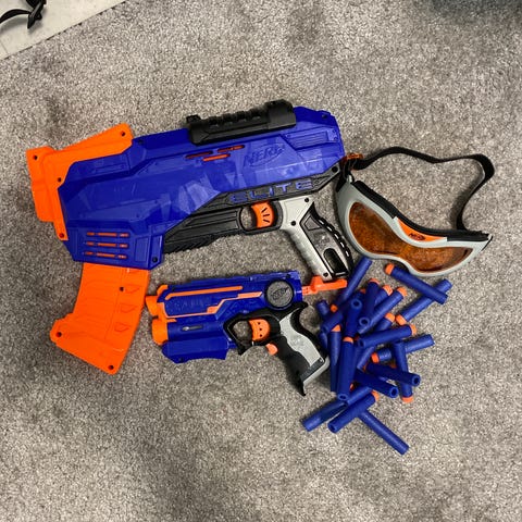 Myydään viisi nerfiä seuraavalle leikkijälle. Toimivia ja ehjiä, mutta ilman panoksia.