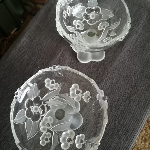 Suuri tarjoilukulho ja 2 kpl pienempää jälkiruokakulhoa. Materiaali on lasia.