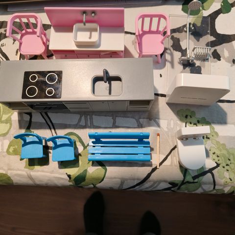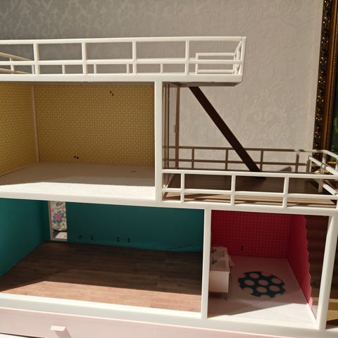 Lundby merkkinen nukkekoti. Mukaan kuvissa näkyvät pääosin itsetehdyt kalusteet. Itse nukkekoti on ok kunnossa. Osasta ovista ja ikkunoista on sarana rikki. Muuntajaa sähköjä varten ei ole. Nouto Ounasmetsästä.