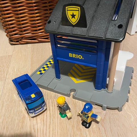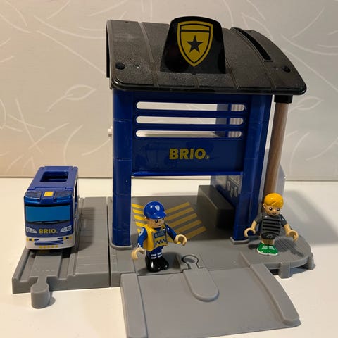 BRIO poliisiauto ja poliisiasema. Sisältää sinisen poliisiauton, poliisiaseman rakennuksen ja poliisihahmon sekä rosvon (ei kuvassa).