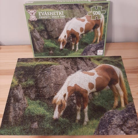 Kaksi palapeliä, joissa molemmissa 1000 palaa. Kumpaakaan ei ole tehty, hevospeliä joskus vähän lajiteltu pusseihin. Kaikki palat pitäisi löytyä. Paketit avattuja, joten en voi vannoa että yksikään ei puuttuisi. Siksi ihan nimelliseen hintaan lähtee seuraavalle.