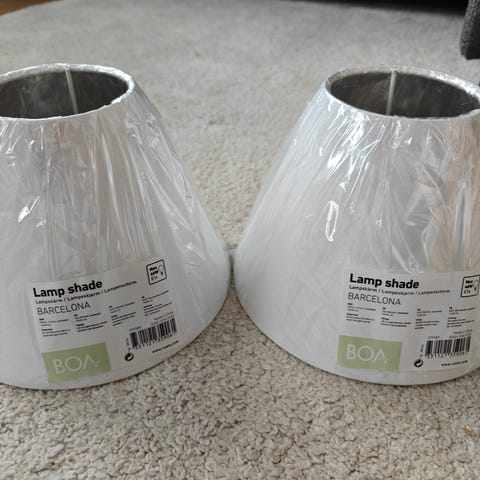 2 kpl hyväkuntoiset täysin ehjät beigen väriset lampunvarjostimet, joissa messinkiset kapeat koristenauhat ylä- ja alareunassa, materiaali muovikalvoa, väri beige.