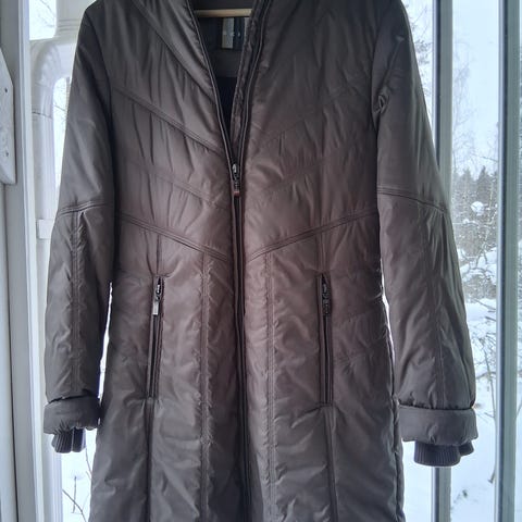 Ohuempi talvitakki lämpimämmille talvikeleille ja pikkupakkasille. Väri tummansininen. Selän puolella kiristyssäätö. Kiinteä huppu.