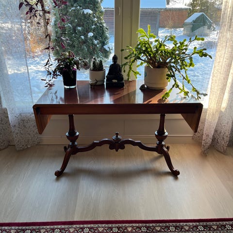 Rustiikki iso klaffipöytä moneen käyttöön. Ei ole kaikilla. Kuvassa avattu vain toinen puoli. Yksin hankala siirrellä. Mahdollisesti kuljetus Klaukkalan ja Finnoon välimaastoon, tai lähialueelle.