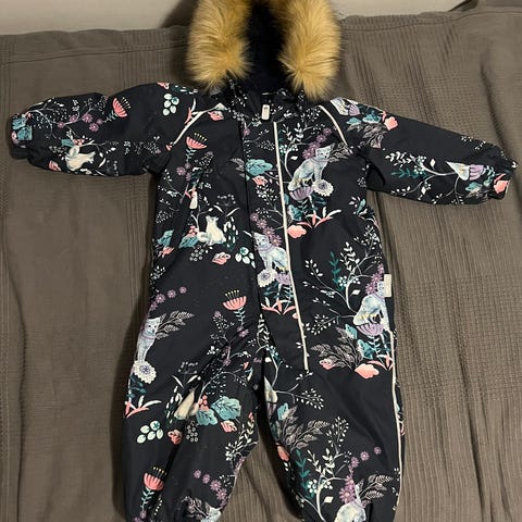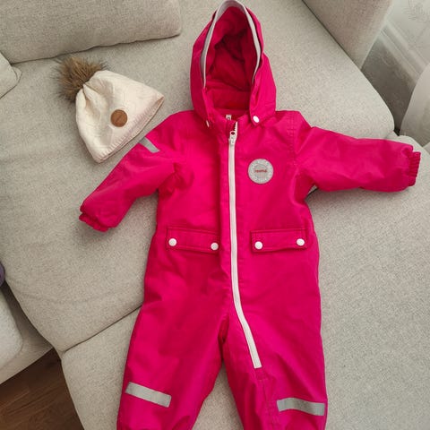 Todella suloinen ja hyväkuntoinen Reiman Lappi -talvihaalari ja Metsolan okranvärinen kypärämyssy kokoa 1-2y. Käytetty samanaikaisesti.
