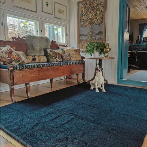 Rauhallinen, tyylikäs ja hienostuneen viileä. Tummansininen matto tuo kotiin syvyyttä ja selkeää kontrastia, joka korostaa sisustuksen muita sävyjä kauniisti. Sävy muistuttaa yönsinistä tai syvää musteensinistä, ja se luo tilaan rauhoittavan, jopa hieman ylellisen tunnelman.
