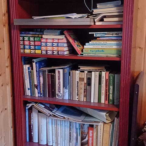 Hyllykokonaisuus kohtalaisessa kunnossa. Pinta on käsitelty tummaksi, ja pinta on paikoittain kulunut pois.