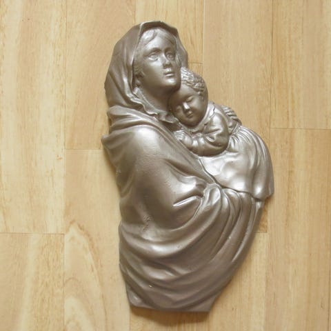 Äiti ja lapsi - koriste, kullan värinen, ilmeisesti kipsiä. Korkeus n. 20 cm, max leveys n. 11, max paksuus n. 4 cm. Postitus onnistuu postimaksuja vastaan.