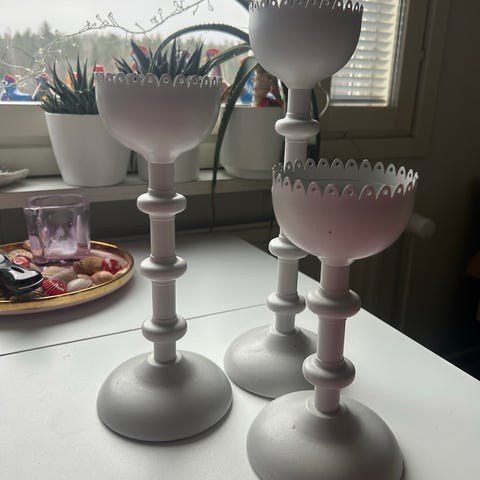 Metallinen pitsiseltä näyttävä alusta isolle pöytäkynttilälle Ikea Skurar