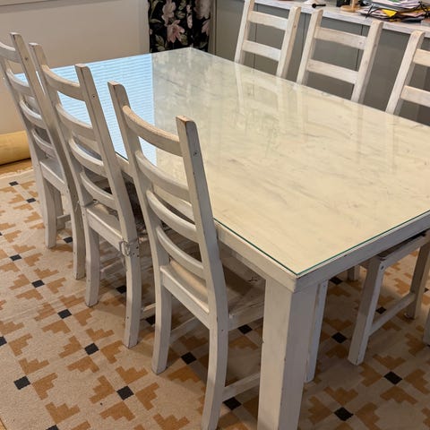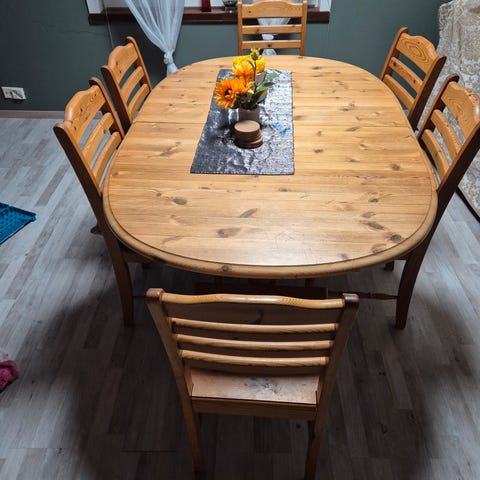 Carina Bengs suunnitelema ruokailuryhmä, massiivimäntyä . Hyvässä kunnossa koko setti, jämäkkä ja tukeva. Jatkettuna pöydän pituus 220. Kaikki jalat pehmustettu. Väriltä antiikki.