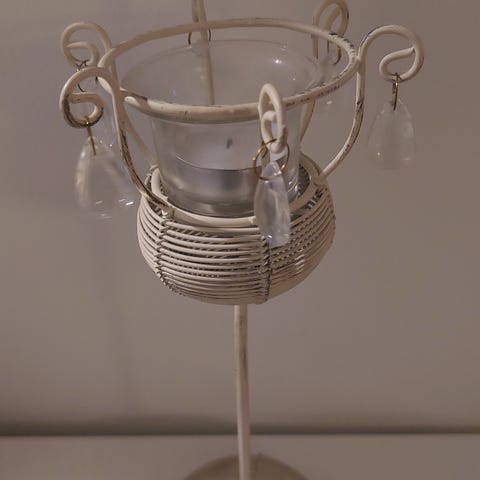 Metallinen kynttilänjalka kahdelle tuikulle. Metalliosa musta, tuikkukupit sinisiä.