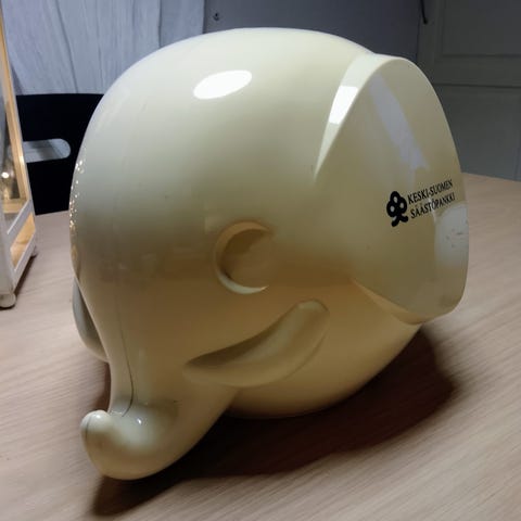 Sininen norsu säästöpossu, muovinen, pieni koko. Sopii lasten säästämiseen ja koristeeksi.